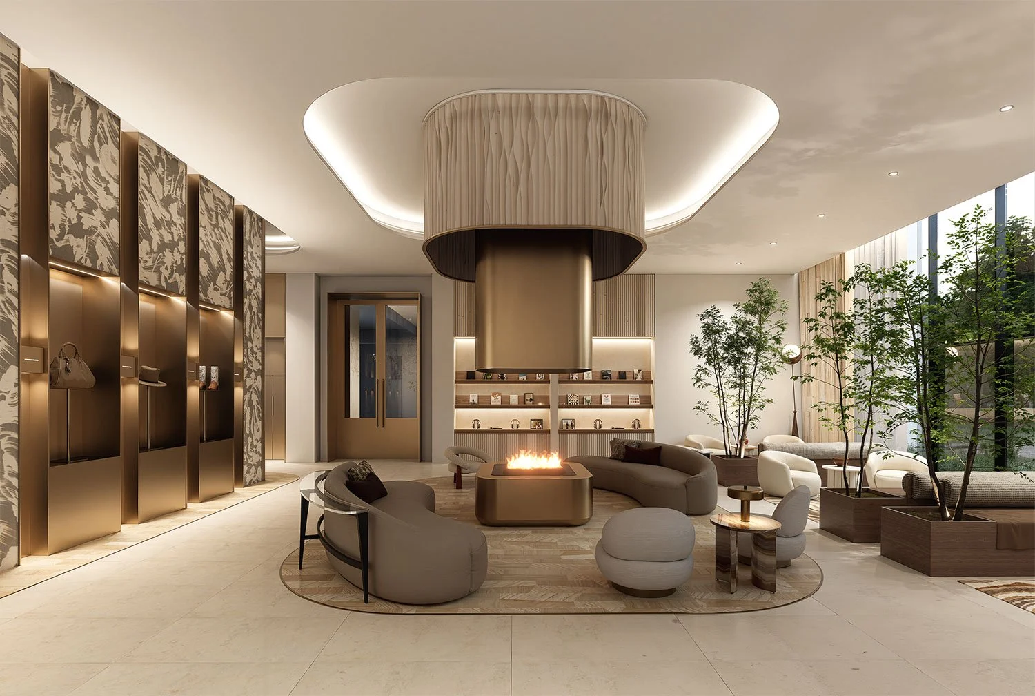Lounge-style seating clusters rather than stiff waiting areas.